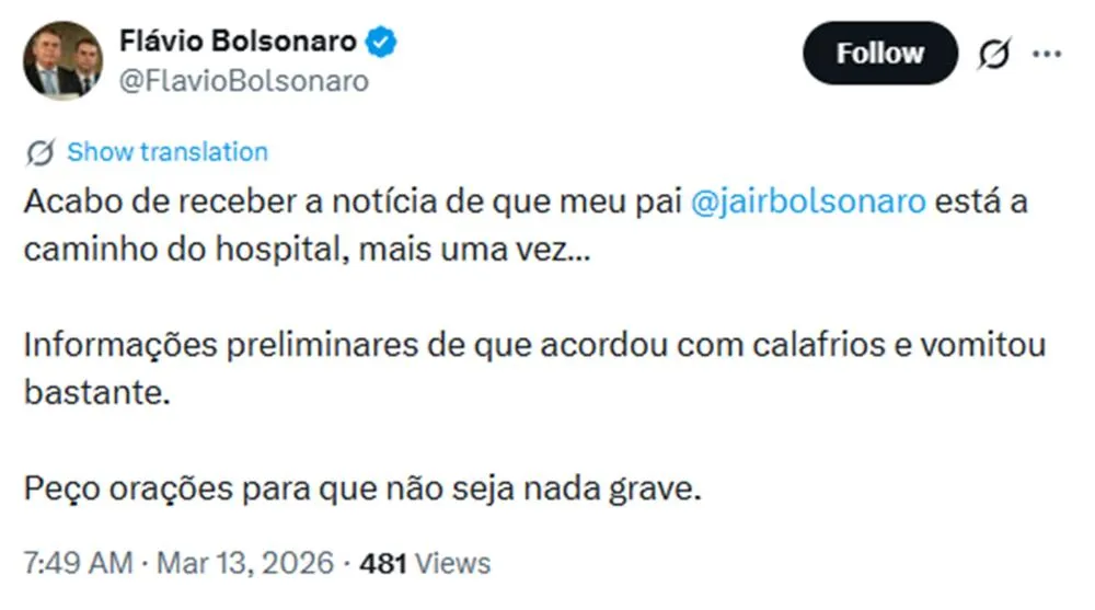 Pouco antes das 8h. em post nas redes sociais, o filho mais velho de Bolsonaro escreveu que o pai estava a caminho do hospital. Veja: