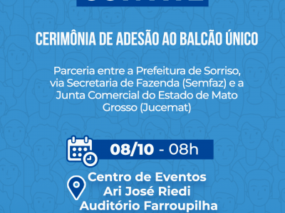 Sorriso vai aderir ao programa Balcão Único, lançado, em 2021, pelo Governo Federal. A cerimônia de adesão à proposta será no dia 8 de outubro, às 8h, no Auditório Farroupilha, do Centro de Eventos Ari José Riedi.